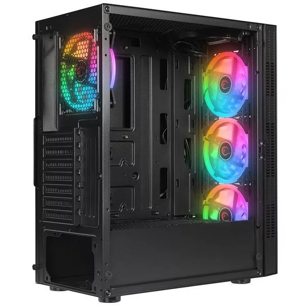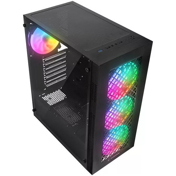ATX, Black, 2x3,5", 2x2,5", 2xUSB2.0, 1xUSB3.0, Audio, Táp nélkül, Ventilátor:4x12cm, Tempered glass window, RGB, Gamer