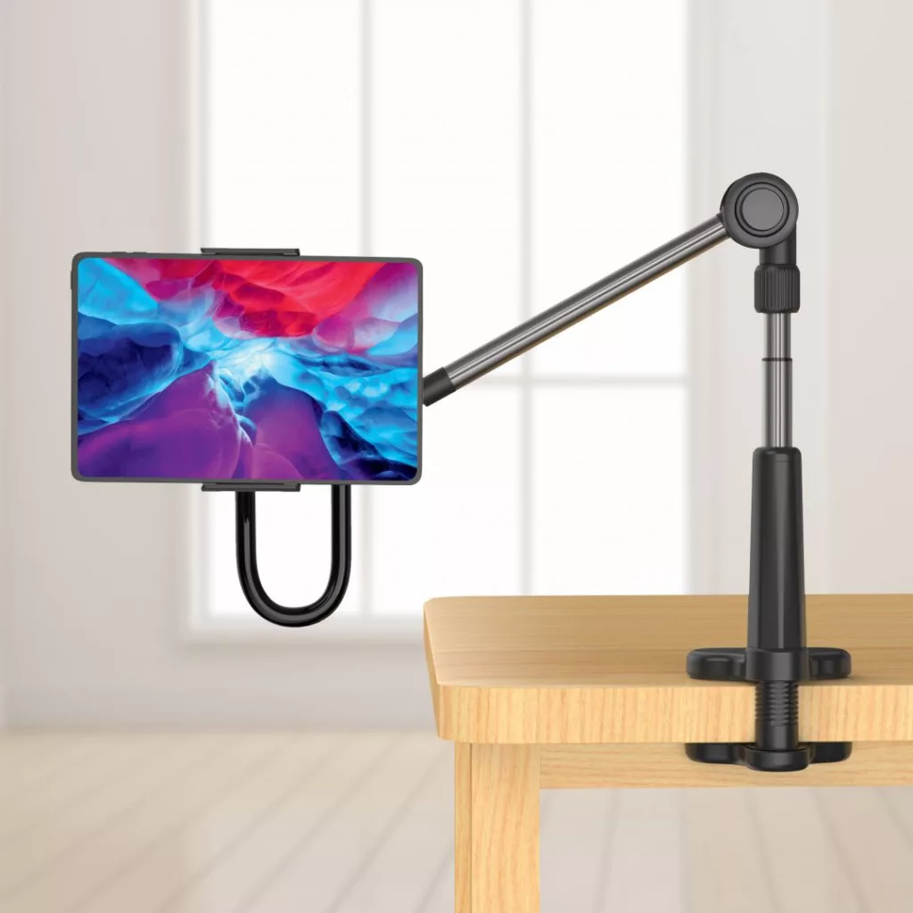 Minden 7-13 hüvelykes készülékhez használható. A gyorsrögzítő rendszerrel, belső párnázással és 360°-ban forgatható fejjel ellátott fogó tökéletesen alkalmas a rögzítésre. A tartó karja kiváló minőségű alumíniumból készült, és több állítható részből áll. Két különböző magasságban állítható és rögzíthető, szükség szerint dönthető, a hattyúnyak segítségével pedig az utolsó részt is beállíthatjuk úgy, hogy a tablet vagy a telefon jól látható legyen.