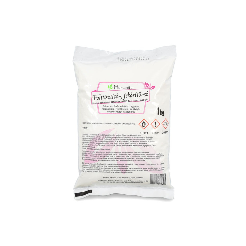 A folttisztító-fehérítő só egy széleskörben alkalmazott környezetbarát tisztítószer, az aktív oxigénes folteltávolítók, fehérítők hatóanyaga. Vízben oldódva a nátrium perkarbonátból mosószóda (nátrium-karbonát), víz, valamint aktív oxigén keletkezik. Az aktív oxigén erős tisztító, fehérítő, folteltávolító képességgel rendelkezik.Használhatjuk mosáshoz, áztatáshoz, folteltávolításhoz, folttisztításhoz, ruhák-, függönyök fehérítéséhez, színek felfrissítéséhez.Kiváló a sütő tisztításához, edényekhez, serpenyőkhöz. Használhatjuk mosódióhoz, mosószódához, mosógömbhöz. Használati javaslat: A megnedvesített foltra szórjunk kevés folttisztító sót, majd enyhén dörzsöljük be.Kis időre hagyjuk állni, majd öblítsük ki, vagy mossuk ki a ruhát normál mosóprogrammal. Tegyünk a mosáshoz is nátrium-perkarbonátot, ezzel a színeket védjük és fokozzuk a mosószerünk hatékonyságát.Makacsabb foltok esetén a kezelést megismételhetjük.Gépi mosáskor elegendő 2-3 evőkanállal a mosópor adagoló rekeszébe szórni.Áztatáskor 5 liter hideg vízhez adjunk 2-3 evőkanál nátrium-perkarbonátot.Nagy hasznát vehetjük olyan szerves foltok és szennyeződések eltávolításánál, melyek eddig komoly fejtörést okoztak: hatékonyan megbirkózik a nehezen eltüntethető fű, tea, piros gyümölcs foltokkal is (málna, szeder, ribizli stb.). Nem fakítja a színeket. Roncsolás-mentesen tisztítja a ruhát, szövetet. Figyelmeztetés: Száraz, hűvös helyen, gyermek elől elzárva tárolandó. Ingredients: min. 91% nátrium-perkarbonát