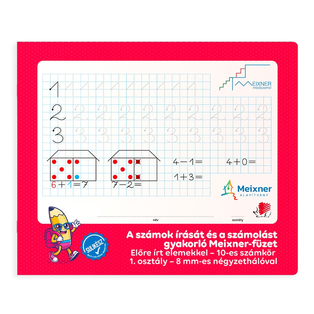 A számok írását és a számolást gyakorló Meixner-füzet az 1. osztályosok számára a 10-es számkörben, amely a Meixner Alapítvány együttműködésével és ajánlásával jött létre. Az első osztályosoknak készült füzetben a nagyobb, 8 mm-es négyzetháló és egyszerű elemekből felépített írásminták segítik a számok és műveleti jelek írásának kialakítását.
