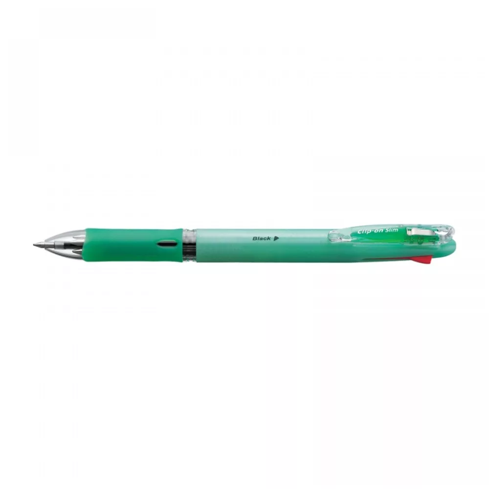 Négy funkciós golyóstoll, de a toll teste mégis vékony, gumírozott fogórész, csipeszes klipsz , alapanyagának 74%-a újrahasznosított anyagokból származik. Írás színe kék+piros+fekete+zöld. Betét SK.10db/gyűjtő, 1000db/karton, Katalóguskód: 798