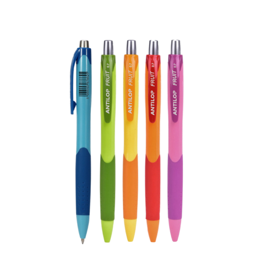 Antilop Fruit prémium minőségű nyomógombos, csúszásmentes gumírozott testű golyóstoll, vegyes neon színű külső testtel. A betét kék színű olajzselés tintát tartalmaz, mely könnyű gördülékeny írást tesz lehetővé. Írásvastagság: 0,7 mm Kiszerelés: 12 db/doboz.Katalóguskód: 46147
