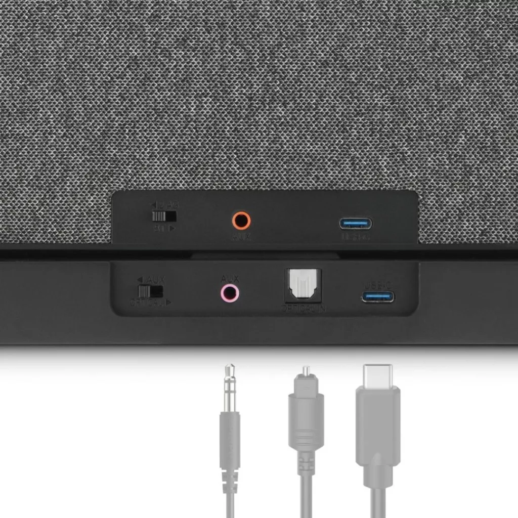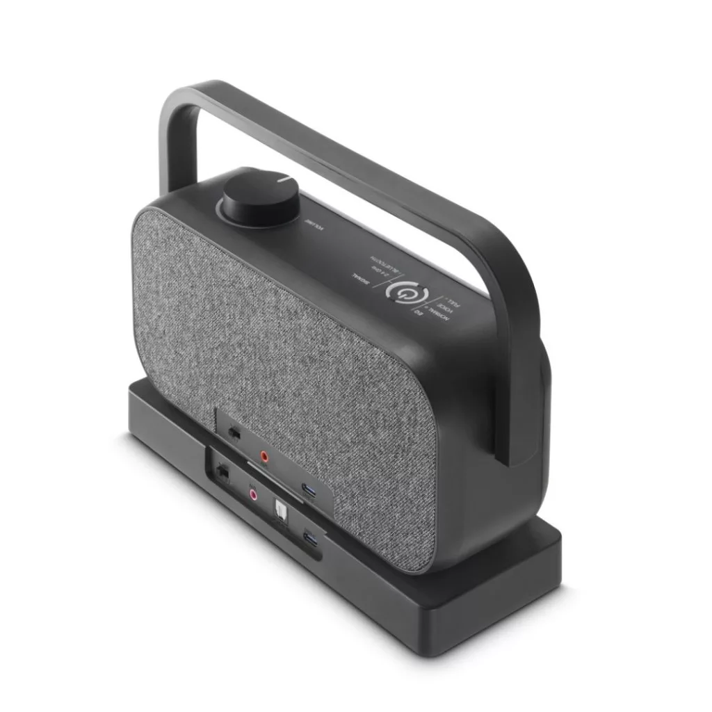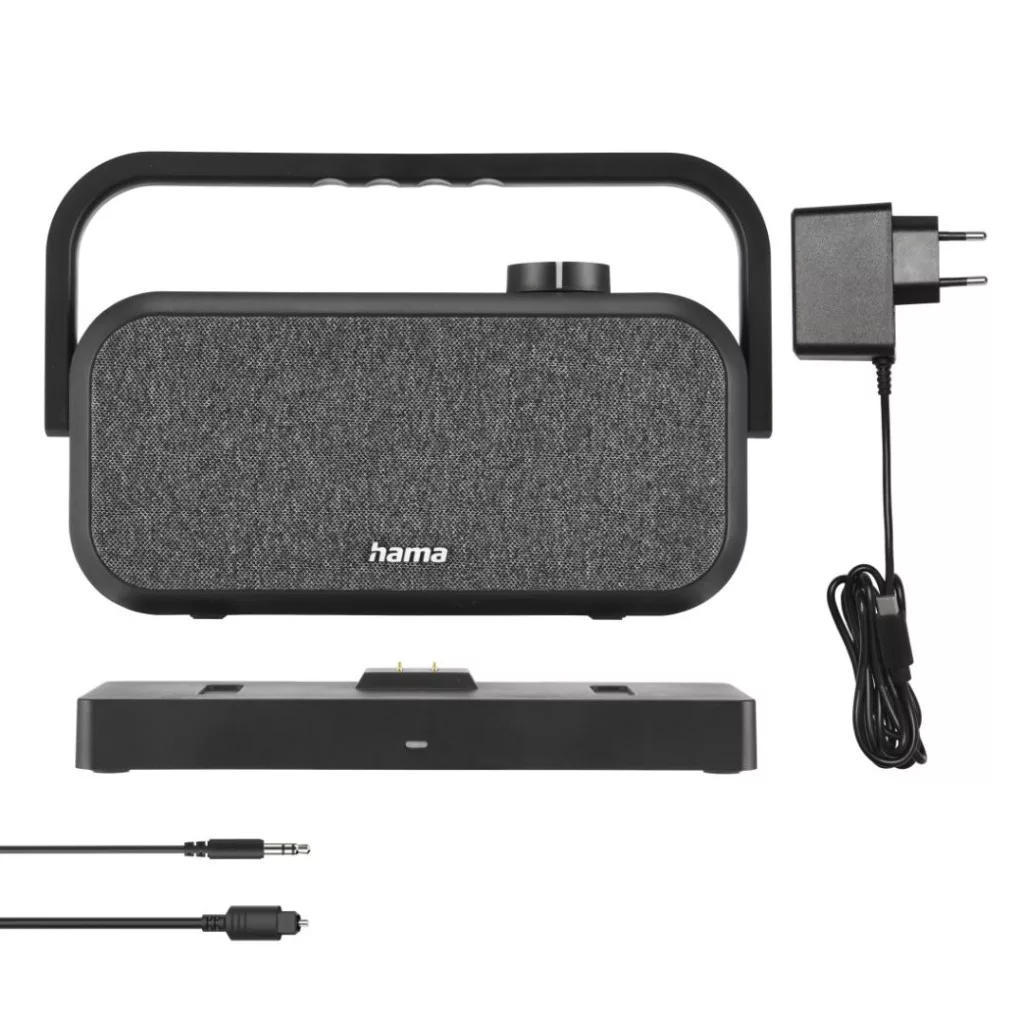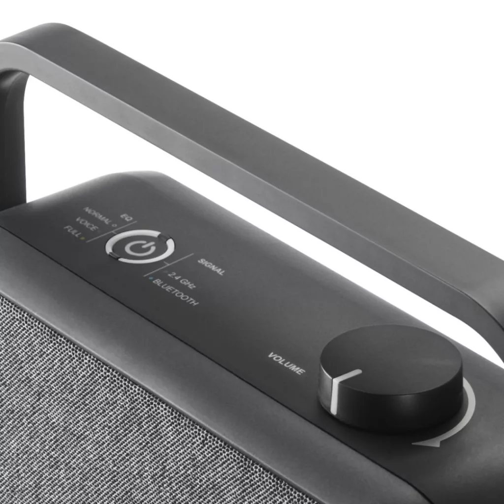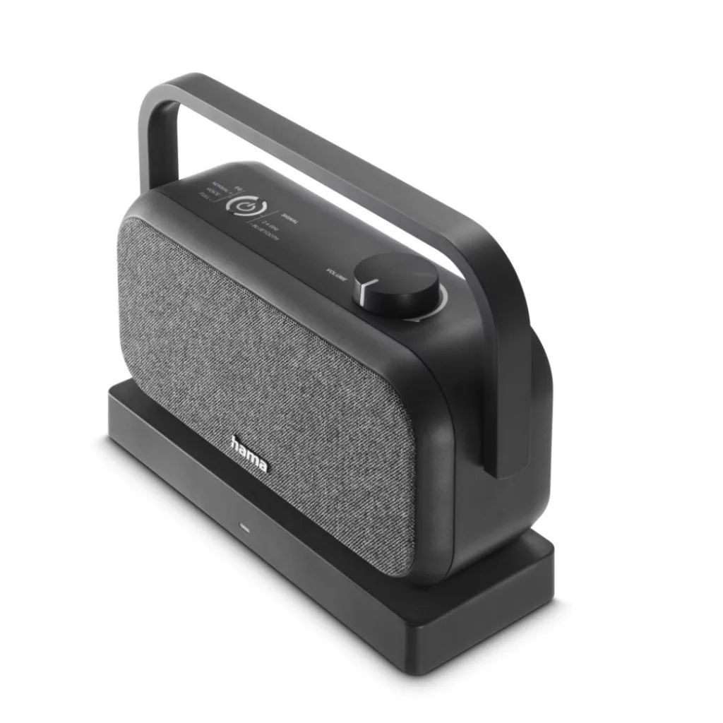 - Azonnal 2,4 GHz-es rádiófrekvencián: miután a töltőállomást csatlakoztatta a tévéhez, a hangszóró minden alkalommal automatikusan csatlakozik