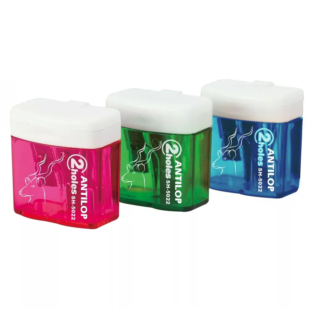 Antilop SH5022 műanyag 2 lyukú tartályos hegyező karton displayben vegyes csomagolással. 12DB/GYŰJTŐ 720DB/KARTON Katalóguskód: 16973