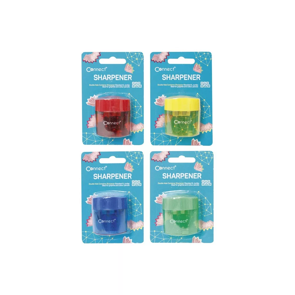 Műanyag fedeles tartályos 2 lyukú hegyező. Normál és jumbo ceruzákhoz. 4 féle vegyes színben. Katalóguskód: 22873