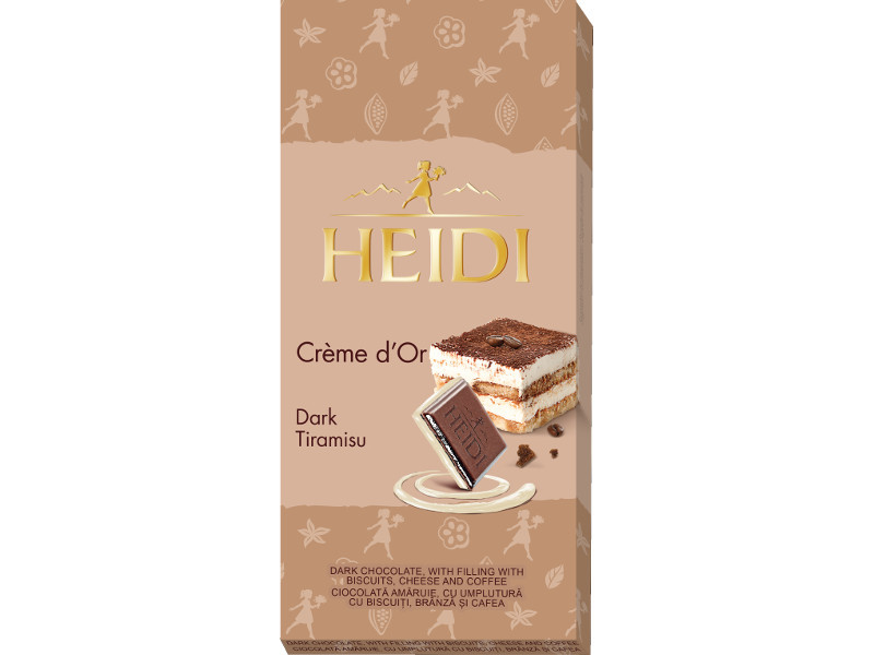 Semleges, webshopba való bemutató a Heidi Creme d’Or Dark Tiramisu ízvilágához. A 90 g-os kiszerelés praktikus desszertként vagy uzsonnaként kínálható, kiemelve a krémes tiramisu-jellemzőket sötét étcsokoládé bevonattal.