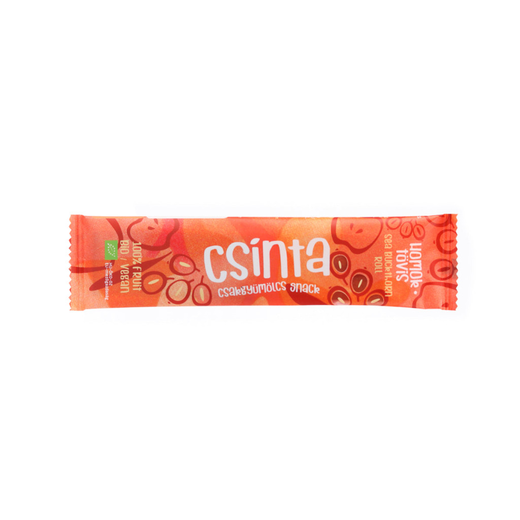 A Csinta csak gyümölcs snack, mely elevenséget visz a hétköznapokba és megszínesíti a közös kalandokat. Természetes energia utánpótlás a hét minden napjára. 100% gyümölcs és semmi más. A gyümölcsök legjavát szárítjuk alacsony hőfokon, hogy a lehető legtöbb vitamin és természetes íz jusson el hozzátok!Összetevők: Alma, homoktövis és semmi más.Egyéb allergén információ: Nyomokban diót, szezámmagot tartalmazhat.Átlagos tápérték 100g termékben:Energia: Energia: 1346kJ/318kcal Zsír 0,9g -amelyből telített zsírsavak: 0g Szénhidrát: 67,9g -amelyből cukrok: 63,8g Fehérje: 1,8g Só: 0g