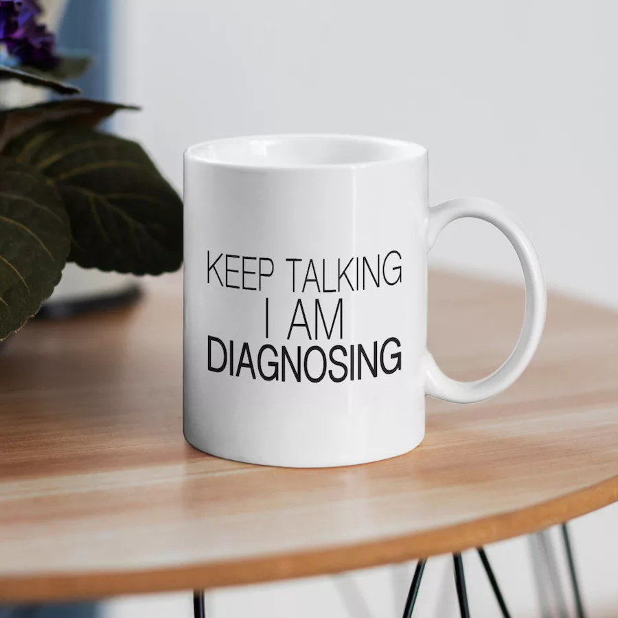 I'm Diagnosing fehér bögre.Bemutatjuk nektek a saját gyártású bögréinket!Rengeteg egyedi minta közül választhatod ki azt, amelyik a legjobban illik hozzád, vagy ahhoz a személyhez, akit meg szeretnél ajándékozni!De tényleg! Annyira sok ötletünk van, hogy bátran állítjuk azt, hogy biztosan megtalálod a tökéletes képpel és szöveggel ellátott bögrét!A kerámia bögrék 300 ml űrtartalommal rendelkeznek, mosogatógépben is moshatók, ráadásul mikrózhatók is! Sőt az egyik legjobb dolog bennük az, hogy két oldali nyomattal láttuk el őket, így a bögre mindkét oldalán láthatod majd a mintát!Csak tudj majd választani közülük! De ér egyszerre többfélére is beruházni! Hisz tudjuk jól, hogy bögréből sosem elég!Minőségi kivitelezés, dizájnos megjelenés jellemezi az összes egyedi tárgyunkat!Űrtartalom: 300 mlAnyag: KerámiaMosogatógépben moshatóMikrózhatóKét oldali nyomat. A nyomat a bögre mindkét oldalán látható.