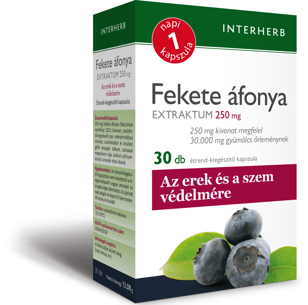 A Fekete áfonya termése antocianidin vegyületekben gazdag, ezek a színanyagok segíthetik szemünket a szabadgyökök elleni védekezésben. Szerepe van a szem kollagén szintjének stabilizálásában, támogatja a szem vérkeringését, ezzel hozzájárul a retina megfelelő működéséhez, az éles látás megőrzéséhez. Hasznos segítség lehet szemfáradtság esetén (számítógépes munkavégzés, fényviszonyokhoz való alkalmazkodás nehézségei esetén). Részt vesz továbbá a normál vérkeringés, a megfelelő hajszáleres véráramlás fenntartásában, így csökkentheti a nehézlábérzést. Összetevők: 250 mg Fekete áfonya (Vaccinium myrtillus) 120:1 kivonat; zselatin; tömegnövelő szer: mikrokristályos cellulóz; csomósodást és lesülést gátló anyagok: talkum, zsírsavak magnézium sója, kolloid-szilícium-dioxid; színezék: titán-dioxid.