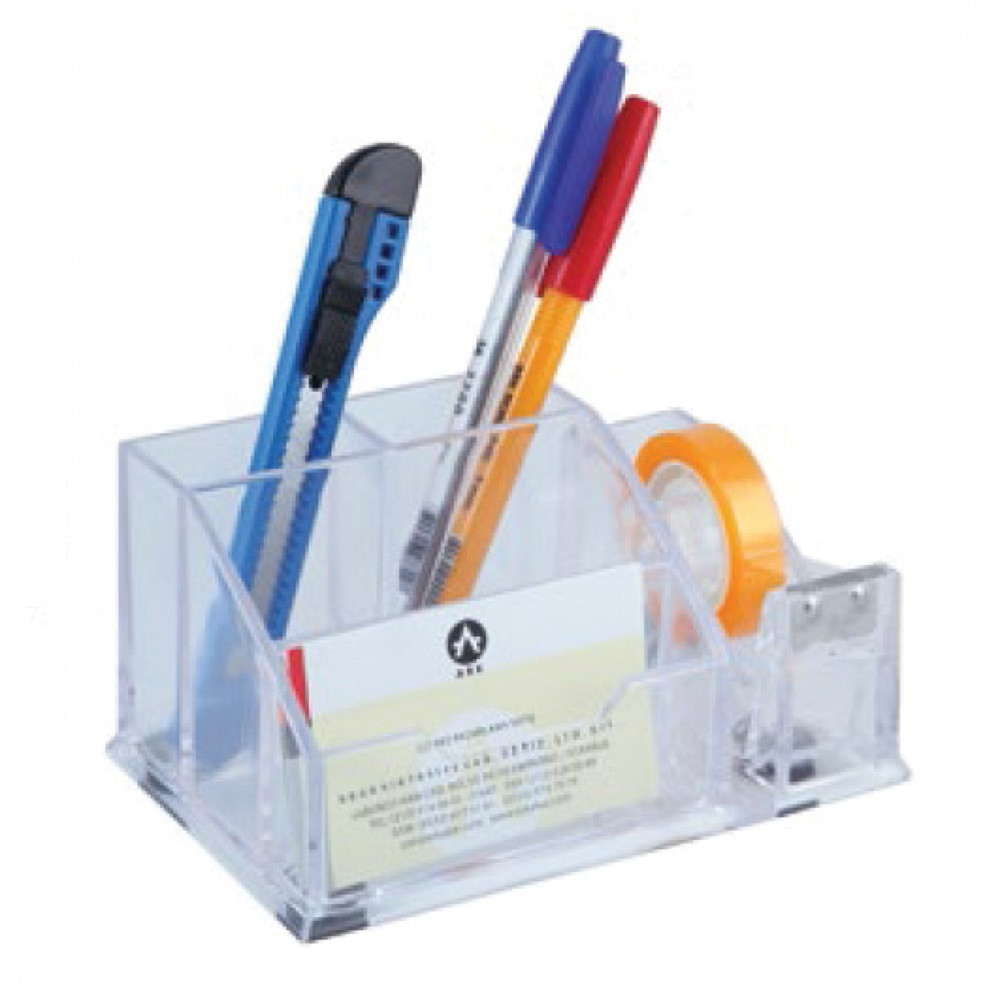 Kiváló minőségű víztiszta asztali írószertartó, rendező. Ideális az irodába vagy otthonra is. Névjegytartó, gemkapocstartó és 2 kisebb rekesz a ceruzáknak, tollaknak, vonalzónak, stb. Jobb oldalán könnyen használható cellux adagolóval. Egyéb tartozékok nélkül szállítjuk. Méret: 150x95x75mm Katalóguskód: 982