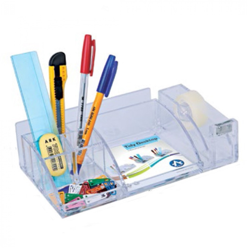 Kiváló minőségű víztiszta asztali írószertartó, rendező. Ideális az irodába vagy otthonra is. Jegyzettömbtartó, gemkapocstartó, levéltartó, 5 kisebb rekesz a ceruzáknak, tollaknak, vonalzónak, stb. Jobb oldalán könnyen használható cellux adagolóval. Egyéb tartozékok nélkül szállítjuk. Méret: 230x125x65mm Katalóguskód: 980