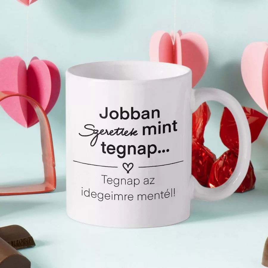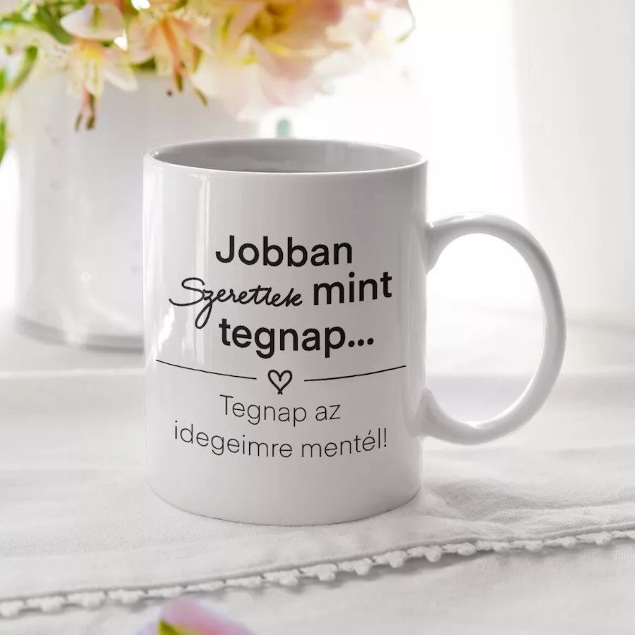 Jobban szeretlek mint tegnap fehér bögreBemutatjuk nektek a saját gyártású bögréinket!Rengeteg egyedi minta közül választhatod ki azt, amelyik a legjobban illik hozzád, vagy ahhoz a személyhez, akit meg szeretnél ajándékozni!De tényleg! Annyira sok ötletünk van, hogy bátran állítjuk azt, hogy biztosan megtalálod a tökéletes képpel és szöveggel ellátott bögrét!A kerámia bögrék 300 ml űrtartalommal rendelkeznek, mosogatógépben is moshatók, ráadásul mikrózhatók is! Sőt az egyik legjobb dolog bennük az, hogy két oldali nyomattal láttuk el őket, így a bögre mindkét oldalán láthatod majd a mintát!Csak tudj majd választani közülük! De ér egyszerre többfélére is beruházni! Hisz tudjuk jól, hogy bögréből sosem elég!Minőségi kivitelezés, dizájnos megjelenés jellemezi az összes egyedi tárgyunkat!Űrtartalom: 300 mlAnyag: KerámiaMosogatógépben moshatóMikrózhatóKét oldali nyomat. A nyomat a bögre mindkét oldalán látható.