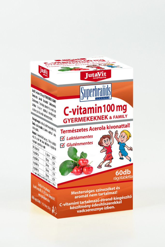 JutaVit C-vitamin 100 mg GYERMEKEKNEK & FAMILY Természetes Acerola kivonattal! Laktózmentes. Gluténmentes. Mesterséges színezéket és aromát nem tartalmaz! C-vitamint tartalmazó étrend-kiegészítő készítmény édesítőszerekkel vadcseresznye ízben.