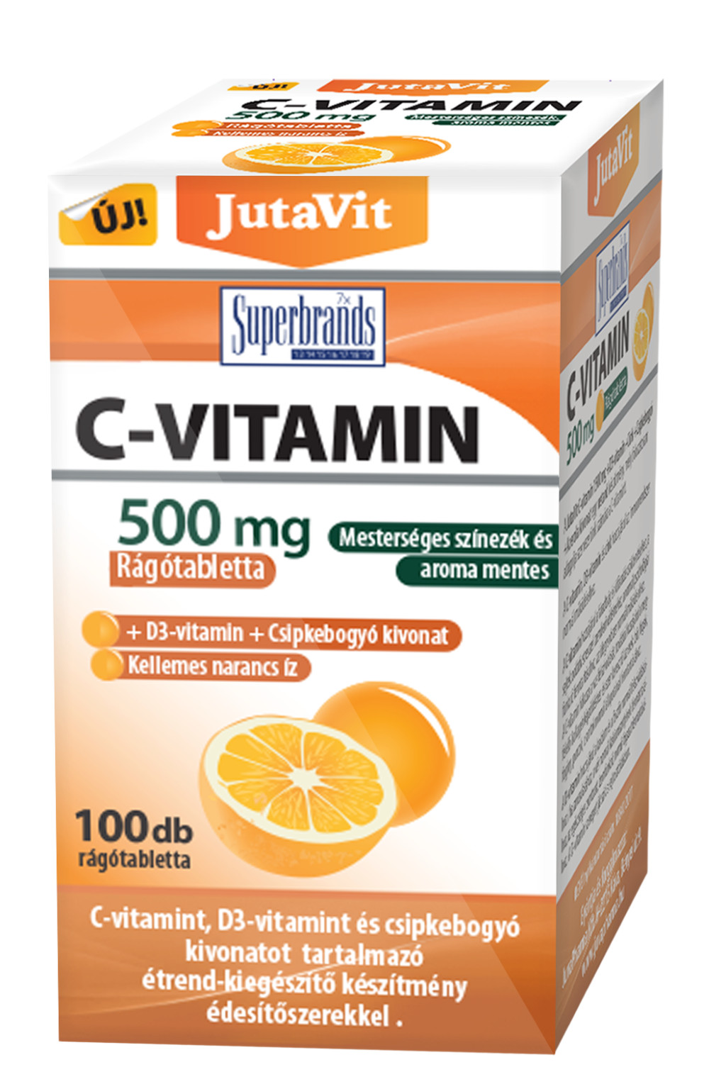 Összetevők: édesítőszerek (szorbit, szukralóz), nátrium-L-szkorbát, L-aszkorbinsav, csomósodást gátló anyagok (zsírsavak magnéziumsói, szilícium dioxid), csipkebogyó kivonat, Quali®D D3-vitamin készítmény (módosított kukoricakeményítő, cukor, antioxidáns [nátrium-L-aszkorbát, alfa-tokoferol], közepes szénláncú zsírsavak trigliceridjei, csomósodást gátló anyag [szilícium-dioxid], kolekalciferol), aroma (narancs [természetes]), tömegnövelő szer (hidroxi-propil-metil-cellulóz), színezék (kurkuma kivonat [természetes]).