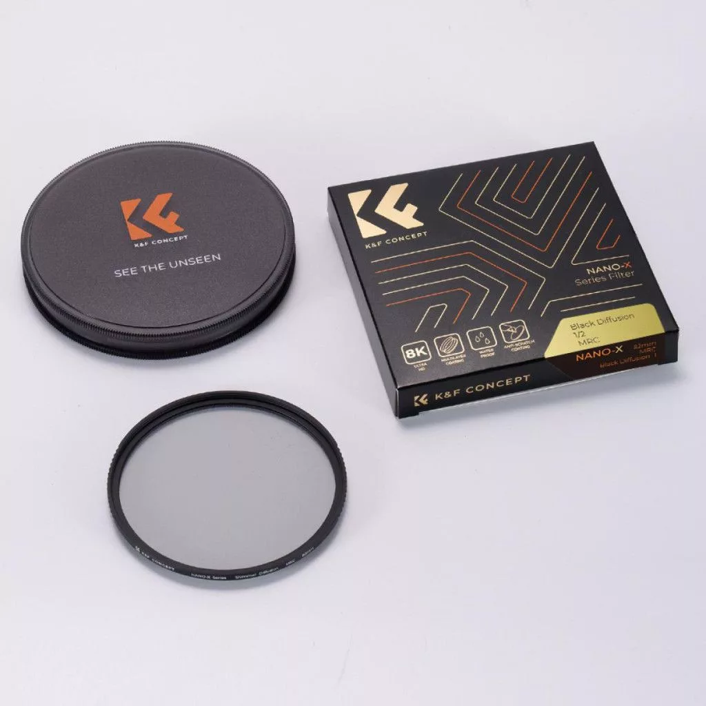 A K&F Black mist 1/2 szűrő csúcstechnológiás bevonattal, vízálló, karcálló és olajálló képességgel rendelkezik. Nincs hatással a képminőségre, könnyen tisztítható és hordozható.