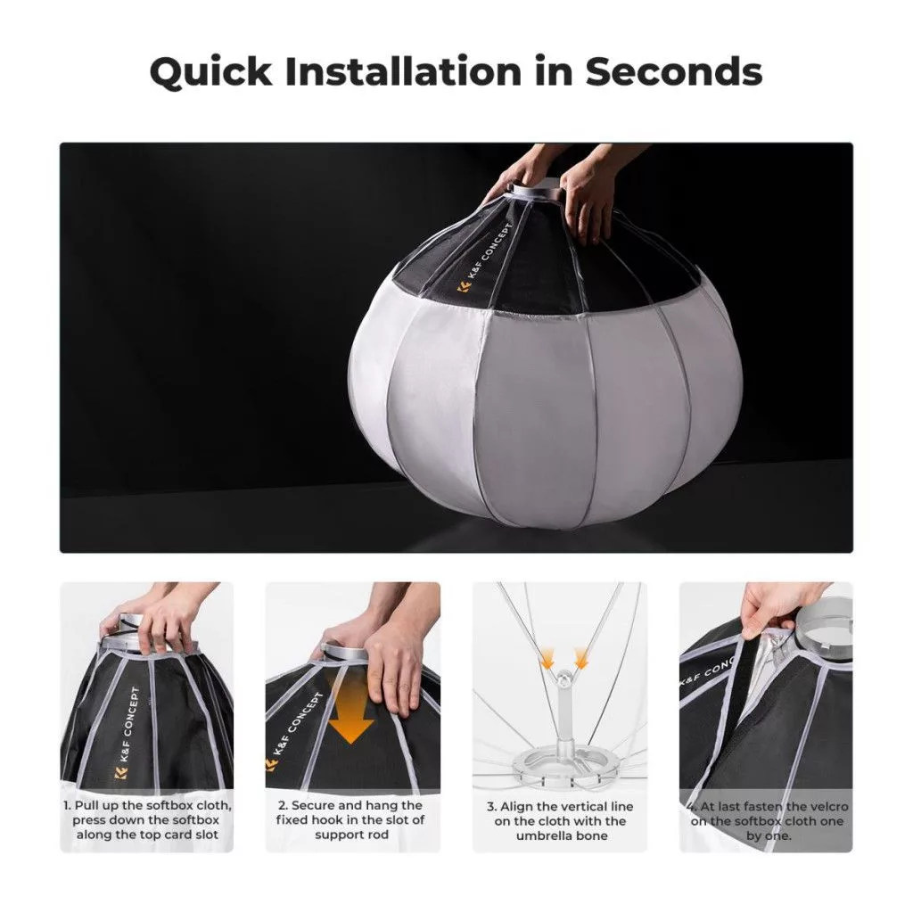 Gyors Beállítás és Összecsukás: Ez a gömb alakú softbox pillanatok alatt nyitható és használatra kész. Tartalomkészítőként vagy filmesként gyorsan kell dolgoznod, és a világításnak nem szabad akadályoznia téged. A lámpás softboxszal bárhol lágy, egyenletes fényt érhetsz el a forgatási helyszíneken.