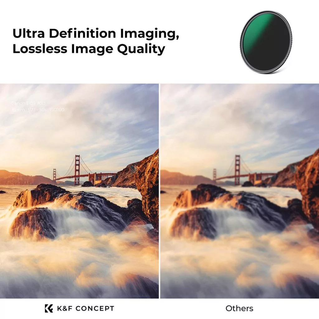 A K&F Concept fix ND szűrő készlete egy fix ND8 (3 fokozat), egy fix ND64 (6 fokozat) és egy fix ND1000 (10 fokozat) szűrőből áll, mely alkalmas portrék, tájképek készítéséhez, illetve hosszú expozíciós és változó fényviszonyok mellett készült fényképekhez.