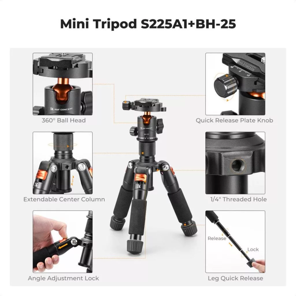 A K&F Concept mini állványa strapabíró anyagokból készült, amelyek hosszú élettartamot biztosítanak. Az állvány masszív felépítése és 6 kg-os teherbírása garantálja, hogy a kamera biztonságosan rögzítve maradjon még akkor is, ha nem teljesen egyenes felületen használod.