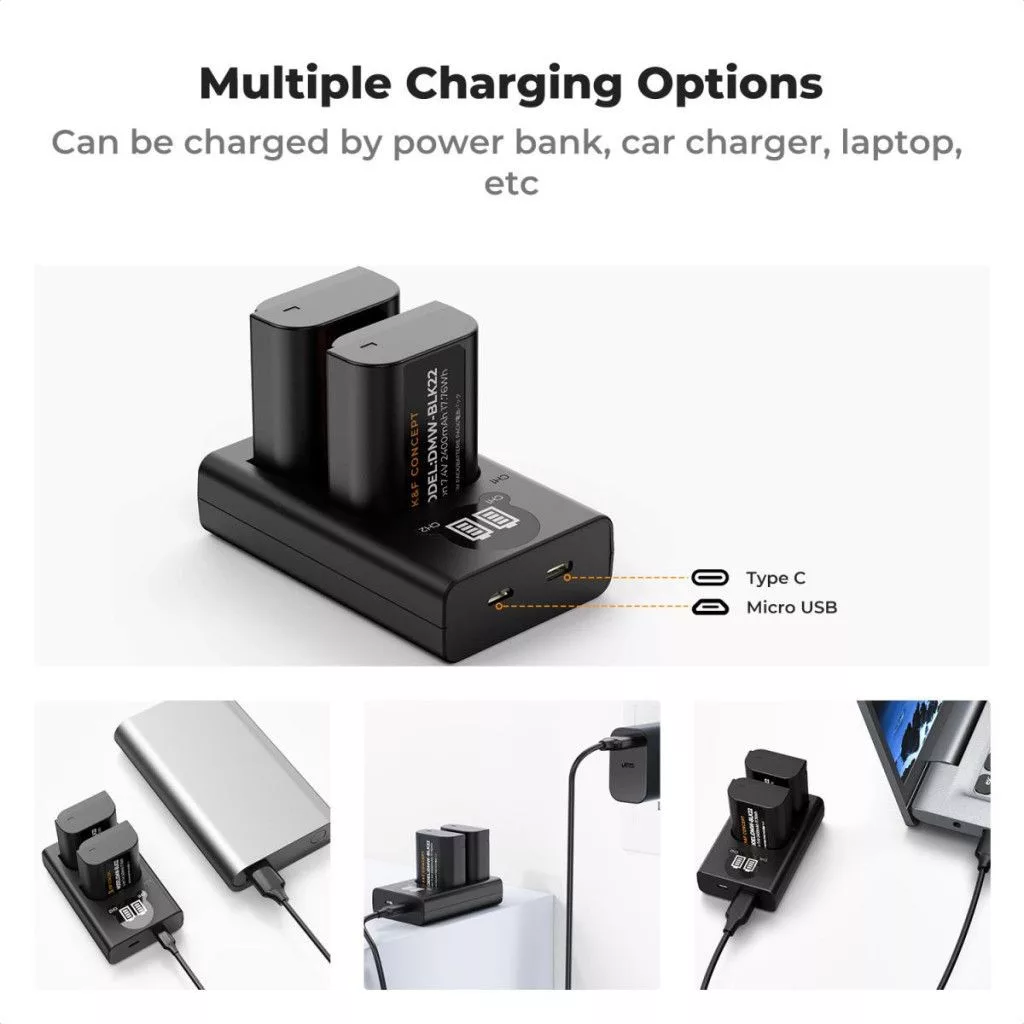 2400mAh erős akkumulátor kapacitás: K&F Concept DMW-BLK22 akkumulátor 2400mAh 7.4V, 17.76Wh kapacitással, amely alkalmas hosszú távú fotózáshoz.