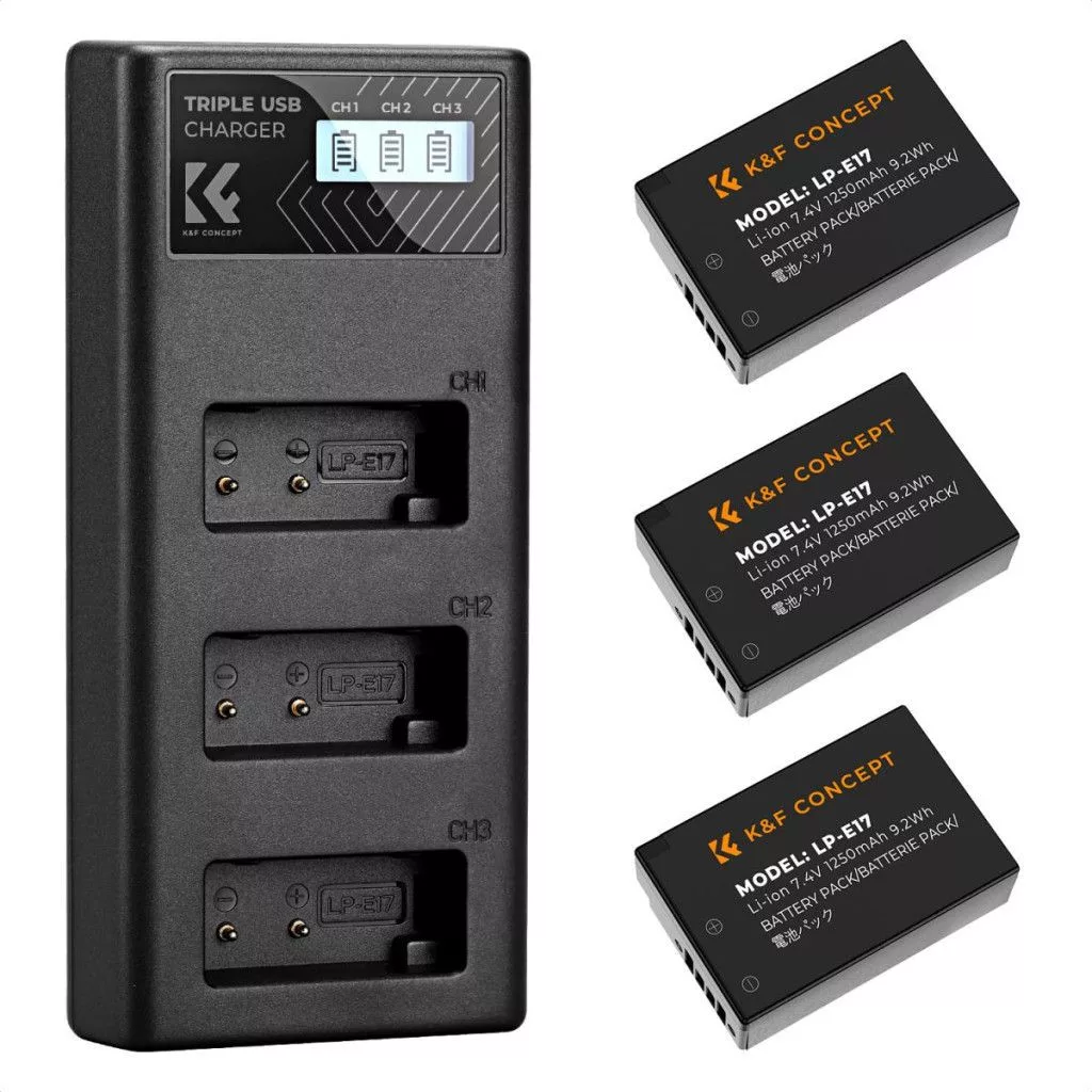 A K&F Concept LC-E17 akkumulátorkészlet ideális megoldás a Canon LP-E17 akkumulátorral működő fényképezőgépek felhasználói számára. A csomag három darab 1250mAh kapacitású LP-E17 akkumulátort és egy modern, három férőhelyes, LCD kijelzős USB-C töltőt tartalmaz, amely kiváló választás stúdió- vagy kültéri munkákhoz egyaránt.