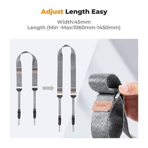 A K&F Concept lapos nyakpánt egy praktikus és kényelmes kiegészítő, amely gyorskioldó csattal rendelkezik. A nyakpánt szélessége 4,5 cm, hossza pedig 100-145 cm között állítható, így ideális a különböző méretű fényképezőgépek biztonságos hordozására.