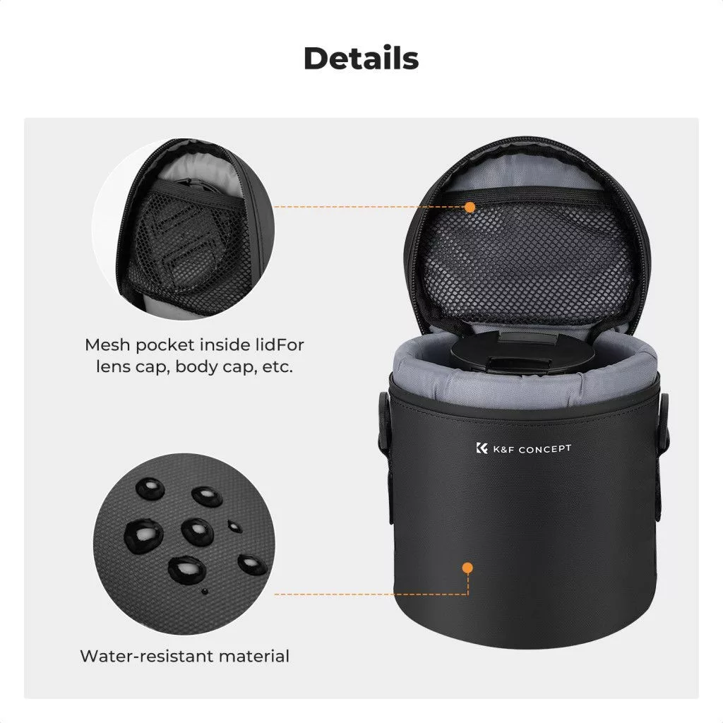 Ez a K&F Concept objektívtartó tok kiváló választás, ha biztonságosan és kényelmesen szeretnéd szállítani vagy tárolni az objektívjeidet. Az elegáns és praktikus kialakítású tok vízálló, tartós anyagokból készült, így maximális védelmet nyújt az objektívek számára.