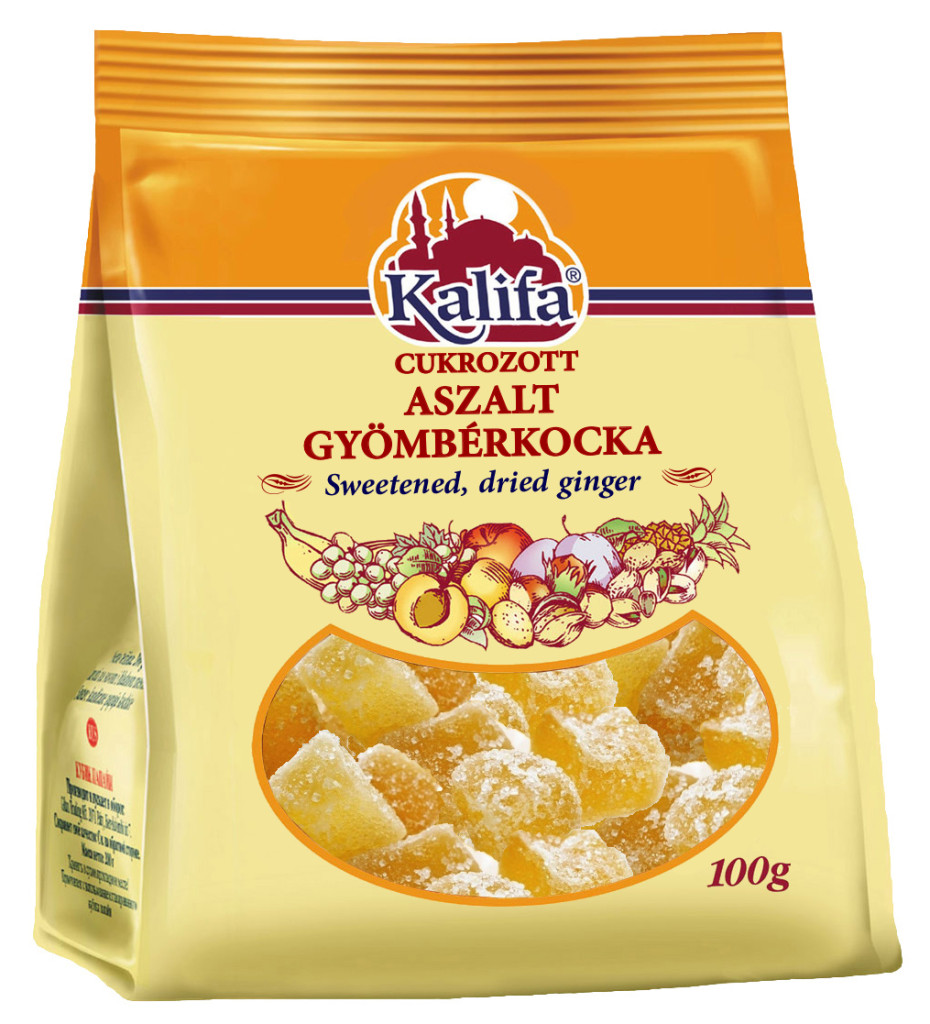 Aszalt gyömbér kocka (Kandírozott) Összetevők: 100 % Kandírozott, aszalt gyömbér kocka (gyömbér, cukor, tartósítószer: kéndioxid) Átlagos tápérték 100 g termékben: Energia 1569 kJ, 369 kcal, Zsír 0,05 g, amelyből telített zsírsavak 0,0 g, Szénhidrát 91,2 g melyből cukor 90,0 g , Fehérje 0,2 g , só 0,183 g.