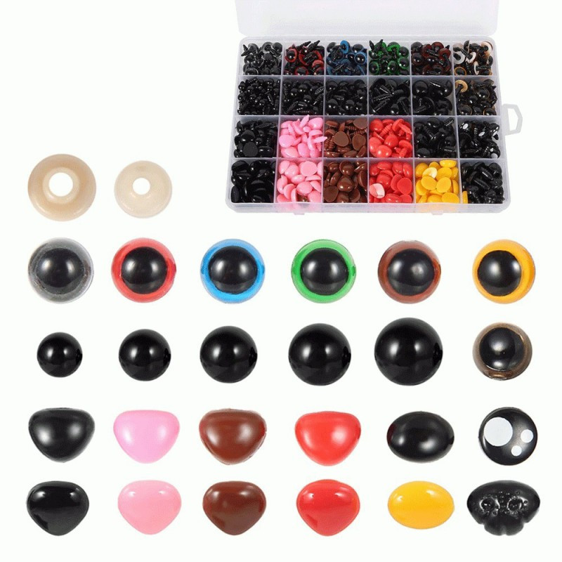 Különböző méretű és színű műanyag szemek, és orrok, valamint a felhelyezésükhöz szükséges rögzítőt is tartalmazza a doboz.