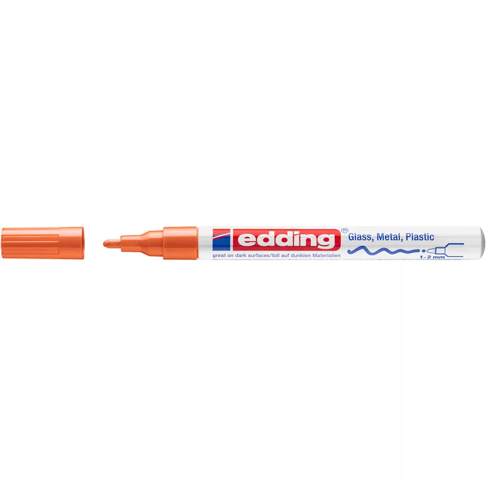 Üveg, porcelán, műanyag, fém illetve szinte minden felület feliratozására, jelölésére alkalmas, különösen ajánlott szennyezett felületekhez, lakk- és dekorációs fémtestű marker. Kerekített csúcs, fémtest, permanent, lakkszerűen fedő festékkel töltve. Gyorsan száradó festék, írásképe törlés- és vízálló, magas fény- hő- és törlésálló. Festékadagolása egyenletes, szelep vezérli, pótcsúcsolható (EDDDING 751 N írócsúcs). Vonalvastagság: 1-2 mm. 10db/dob Katalóguskód: 1245
