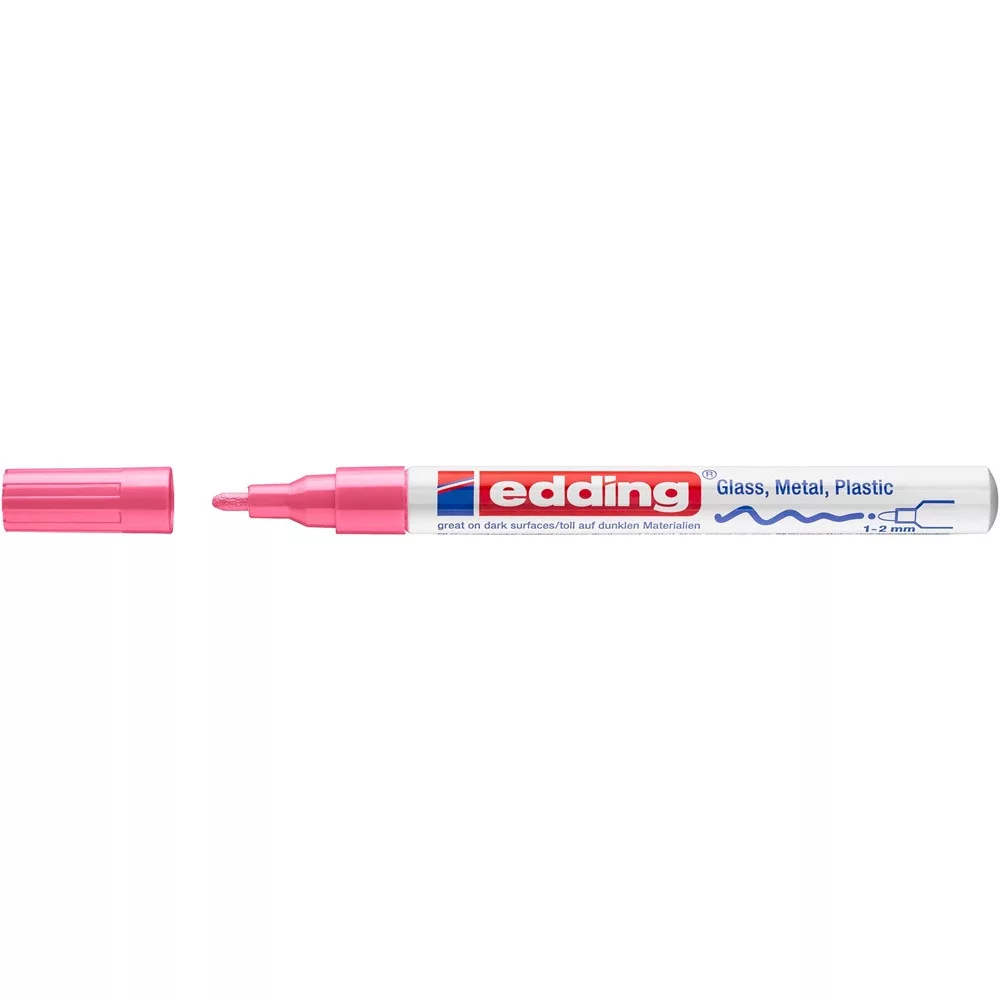 Üveg, porcelán, műanyag, fém illetve szinte minden felület feliratozására, jelölésére alkalmas, különösen ajánlott szennyezett felületekhez, lakk- és dekorációs fémtestű marker. Kerekített csúcs, fémtest, permanent, lakkszerűen fedő festékkel töltve. Gyorsan száradó festék, írásképe törlés- és vízálló, magas fény- hő- és törlésálló. Festékadagolása egyenletes, szelep vezérli, pótcsúcsolható (EDDDING 751 N írócsúcs). Vonalvastagság: 1-2 mm. 10db/dob Katalóguskód: 1251