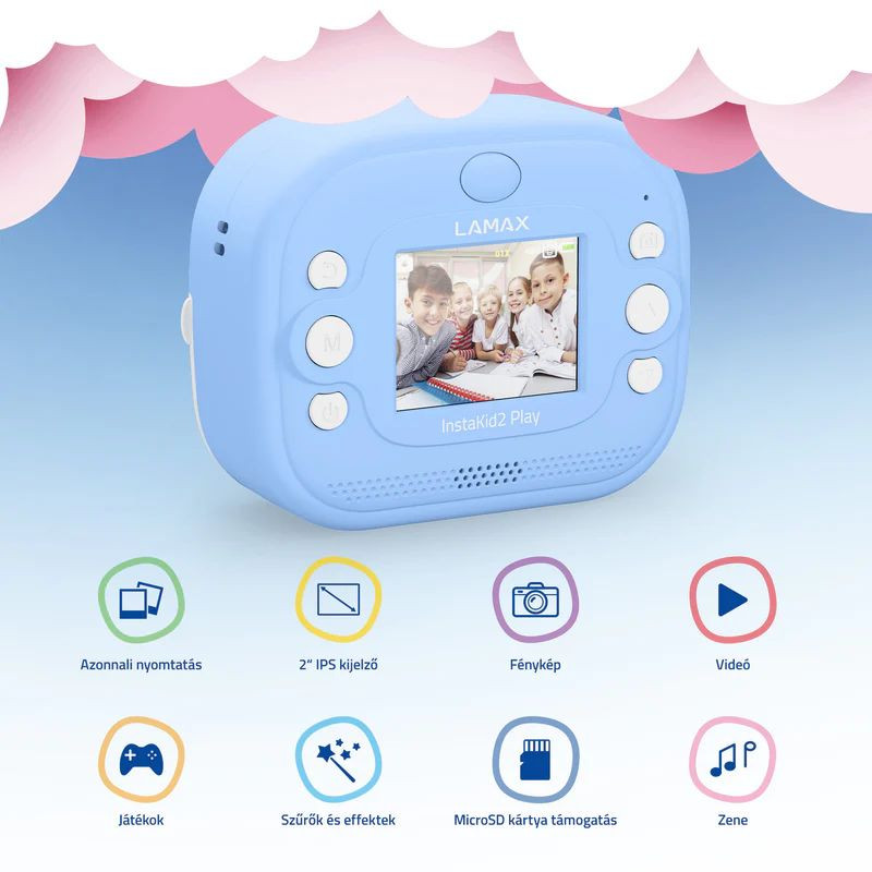 A LAMAX InstaKid2 Play egy olyan kamera, amely nem vesztegeti az időt. A gyerekek könnyedén megörökíthetnek vele minden fontos pillanatot, és egy pillanat alatt a kezükbe is vehetik. A fekete-fehér képek színes emlékekké alakíthatók a csomagban található filctollakkal - csak színezd ki őket, add hozzá a saját albumodhoz, vagy örvendeztesd meg velük a nagymamát. Az egyszerű kezelésnek, a csomagban található két tekercs filmnek (beleértve az öntapadósakat is), az eredeti dizájnnak és a nagy teljesítményű, 48 Mpx-es kamerának és FullHD videórögzítési lehetőségnek köszönhetően a kamera nélkülözhetetlen társ lesz kirándulásokon, ünnepségeken és kreatív délutánokon a barátokkal. Az idősebb gyerekek is imádni fogják, akik microSD-kártyára menthetik képeiket és videóikat, és megőrizhetik első filmes próbálkozásaikat. Rózsaszín vagy kék változatban kapható, és egy praktikus nyakpánt is tartozik hozzá, így a gyerekeknek mindig kéznél van a kamera. És amikor éppen nem fényképeznek? Öt játék közvetlenül a kamerában gondoskodik a szórakozásról. Ez a kamera nemcsak az emlékekről szól, hanem az örömről, az önkifejezésről és a képzeletről is.