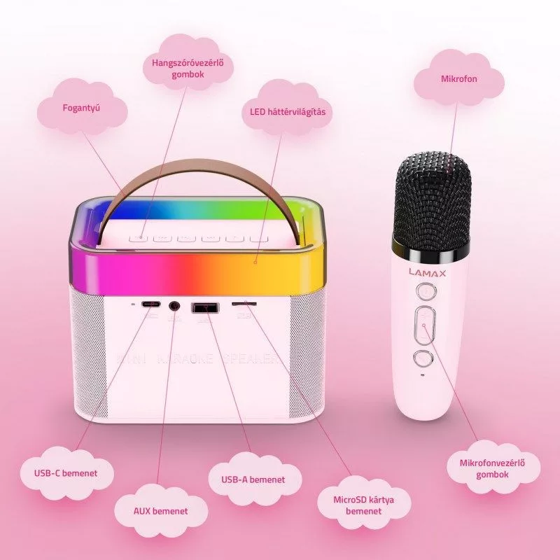A gyerekek nem félnek mindent belemenni, még egy megfelelő zenei műsort sem indítanak el. Ügyesen segíti őket a LAMAX KaraokeKid1 hangszóró hideg kék vagy rózsaszín gyerekkialakítással, amely egy ugyanolyan kifinomult karaoke mikrofonnal is rendelkezik. A hangszóró természetesen mese- vagy zenehallgatásra is használható, de a gyerekek igazán jól fognak szórakozni vele, főleg gyerekparti karaoke közben vagy énekelőadásuk gyakorlásakor. A karaoke mód eltávolíthatja az énekhangot, és minden dalból karaoke verziót hozhat létre. A hangot megváltoztató mikrofonnal még a felnőttek is megúszhatják. Ki ne szeretne démonikusnak tűnni, vagy olyan, mint egy Törp? A megfelelő hangulatot színes LED háttérvilágítás teszi teljessé. A hangszóró egyszerűen csatlakoztatható különféle eszközökhöz a modern Bluetooth 5.3-on keresztül. Ez a hordozható segédjáték bármely kicsiből a legmagasabb szintű zenei sztárt varázsolja.