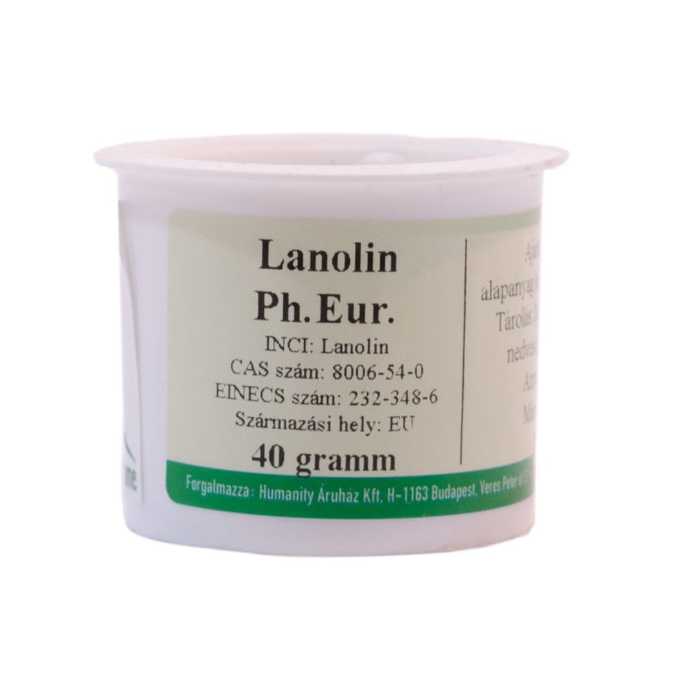 BHT mentes, gyógyszerkönyvi tisztaságú gyapjúzsír. Védi és ápolja a bőrt. Bőrazonos összetételű.Természetes eredetű hidratáló, gyorsan beszívódik a bőrbe. Gyorsítja a sebgyógyulást, bőrlágyító. Natúr krémek, kenőcsök alapanyaga. Jellegzetes illatú, sárgás színű, kenőcsös állagú, viaszos anyag. Használati javaslat: Érdemes magas zsírtartalmú kozmetikai készítményekben alkalmazni, vagy önmagában bőrre kenve. Babáknak készült termékekbe is ajánlott.TIPP: Száraz, kirepedezett bőr esetén éjszakára kenjük be kezeinket lanolinnal, majd húzzunk rá egy pamutkesztyűt. Kezeink újra puhák, hidratáltak lesznek. Zsíros foltot hagy, ezért amíg be nem szívódik a bőrbe, ne nyúljunk semmihez. Figyelmeztetés: 25 °C alatti hőmérsékleten tároljuk. Ingredients: Ceridek, magasabb rendű alkoholok, szteridek, zsírsavak: lanomistric sav, lanopalmitinsav.