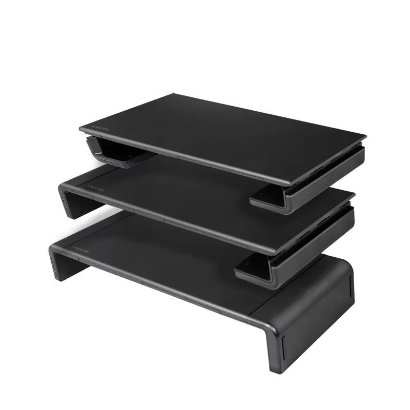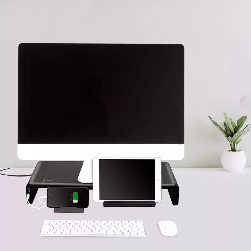 A tökéletes ergonomikus munkaterület! Az összecsukható szerkezet lehetővé teszi, hogy a szélességet (420/470/520 mm) az Ön igényei szerint állítsa be. Az emelő két USB 3.0 és egy USB-C porttal rendelkezik, így lehetővé teszi az adatátvitelt (a mellékelt USB 3.0 kábellel) és az okostelefon vagy táblagép töltését. A fém és műanyag állvány aljára billentyűzet és egér helyezhető. A LogiLink monitorállvány különlegessége a beépített fiókos kialakítás az okostelefon és iPad tartóval együtt. Így még a kisebb tárgyak is tisztán és rendezetten találják meg a helyüket.