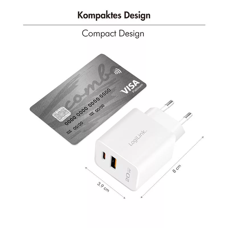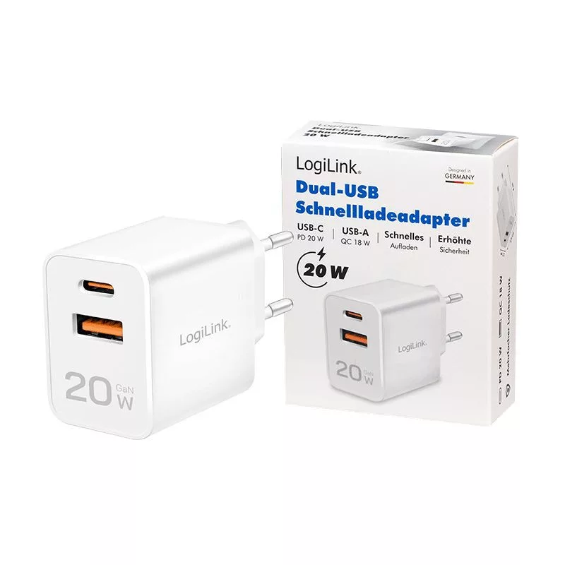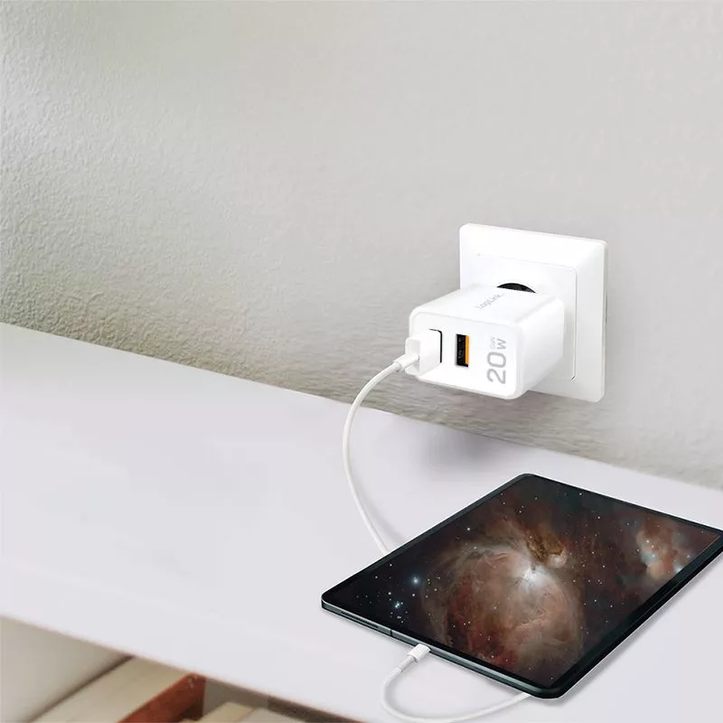 Adapter, 1xUSB-A, 1xUSB-C, 5V/9V/12V, 3A, 20W, PD, White