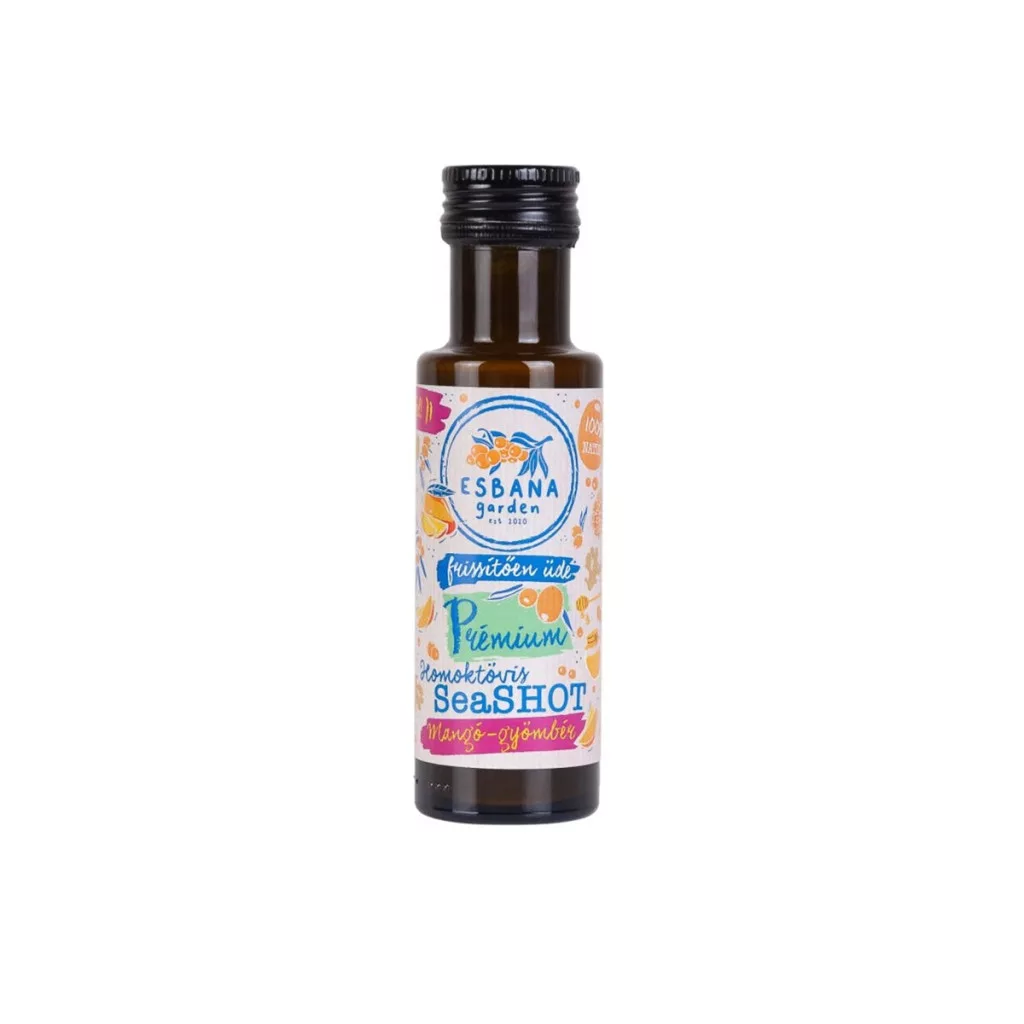 ESBANA SeaSHOT, egy gyümölcsital fűszerekkel, amely feltölt energiával és természetes lendületet ad a mindennapokhoz!A homoktövisbogyót a saját bio minősítéssel rendelkező ültetvényünkön termesztjük. Az ESBANA garden bio homoktövisvelő napi fogyasztását ajánljuk, töményen 1-3 evőkanál.Hígítva egy kellemes friss italt kaphatunk, amit még tovább ízesíthetünk gyümölcslével akár mézzel. Nyári hőségben kiváló limonádét, frissítőt is készíthetünk belőle víz hozzáadásával.Összetevők: bio homöktövisvelő, mangólé (sűrítményből), méz, őrölt gyömbérEgyéb allergén információ: mézÁtlagos tápérték 100g termékben:Energia: 341kj/481kcalZsír: 1.6g Amelyből telített zsírsavak: 0.4g Szénhidrát: 15.3g Amelyből cukrok: 11.3g Fehérje: 0.4g Rost: 1.9g Só: 0.01g