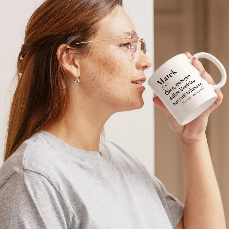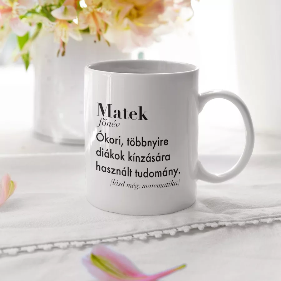 Matek-főnév fehér bögre.Bemutatjuk nektek a saját gyártású bögréinket!Rengeteg egyedi minta közül választhatod ki azt, amelyik a legjobban illik hozzád, vagy ahhoz a személyhez, akit meg szeretnél ajándékozni!De tényleg! Annyira sok ötletünk van, hogy bátran állítjuk azt, hogy biztosan megtalálod a tökéletes képpel és szöveggel ellátott bögrét!A kerámia bögrék 300 ml űrtartalommal rendelkeznek, mosogatógépben is moshatók, ráadásul mikrózhatók is! Sőt az egyik legjobb dolog bennük az, hogy két oldali nyomattal láttuk el őket, így a bögre mindkét oldalán láthatod majd a mintát!Csak tudj majd választani közülük! De ér egyszerre többfélére is beruházni! Hisz tudjuk jól, hogy bögréből sosem elég!Minőségi kivitelezés, dizájnos megjelenés jellemezi az összes egyedi tárgyunkat!Űrtartalom: 300 mlAnyag: KerámiaMosogatógépben moshatóMikrózhatóKét oldali nyomat. A nyomat a bögre mindkét oldalán látható.