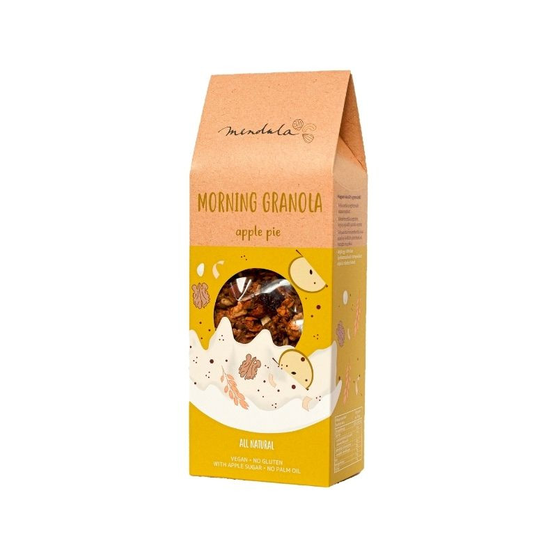 Összetevők: gluténmentes zabpehely, almasűrítmény, mandula, dió, napraforgómag, aszalt alma (7%), mazsola, almacukor, bio hidegen sajtolt napraforgó olaj, fahéj (<1%), gyömbér