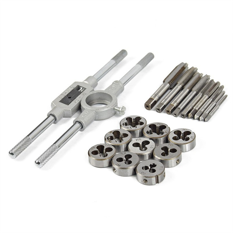 A 20 darabos menetvágó készlet alkalmas mind belső, mind külső menetek vágására is. A készlet tartalmaz tehát külső menetmetszőt és belső menetfúrókat is.