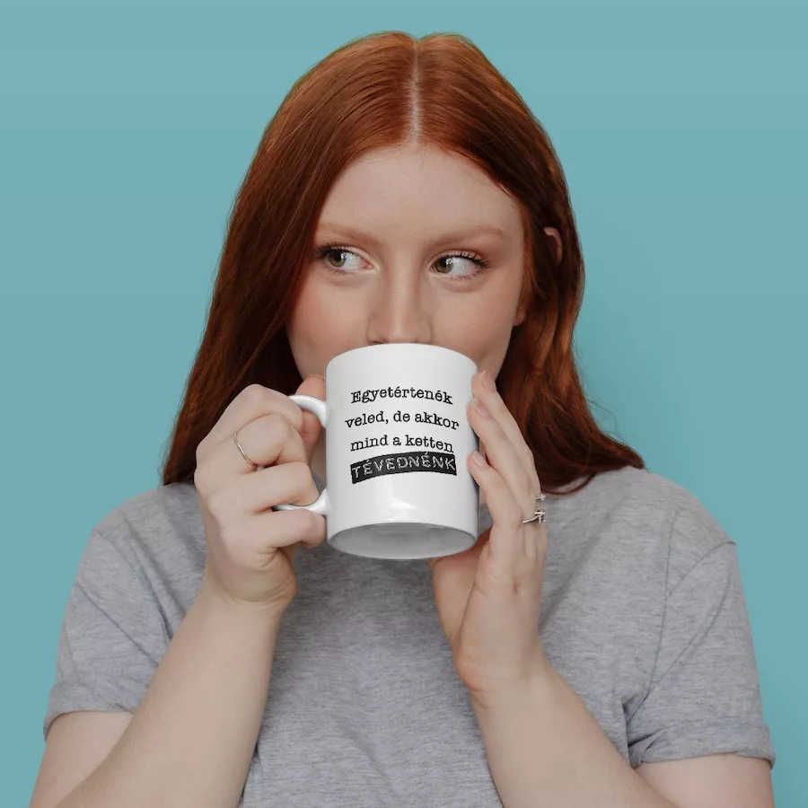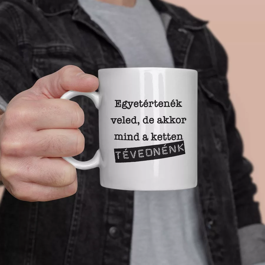 Mindketten tévednénk fehér bögreBemutatjuk nektek a saját gyártású bögréinket!Rengeteg egyedi minta közül választhatod ki azt, amelyik a legjobban illik hozzád, vagy ahhoz a személyhez, akit meg szeretnél ajándékozni!De tényleg! Annyira sok ötletünk van, hogy bátran állítjuk azt, hogy biztosan megtalálod a tökéletes képpel és szöveggel ellátott bögrét!A kerámia bögrék 300 ml űrtartalommal rendelkeznek, mosogatógépben is moshatók, ráadásul mikrózhatók is! Sőt az egyik legjobb dolog bennük az, hogy két oldali nyomattal láttuk el őket, így a bögre mindkét oldalán láthatod majd a mintát!Csak tudj majd választani közülük! De ér egyszerre többfélére is beruházni! Hisz tudjuk jól, hogy bögréből sosem elég!Minőségi kivitelezés, dizájnos megjelenés jellemezi az összes egyedi tárgyunkat!Űrtartalom: 300 mlAnyag: KerámiaMosogatógépben moshatóMikrózhatóKét oldali nyomat. A nyomat a bögre mindkét oldalán látható.