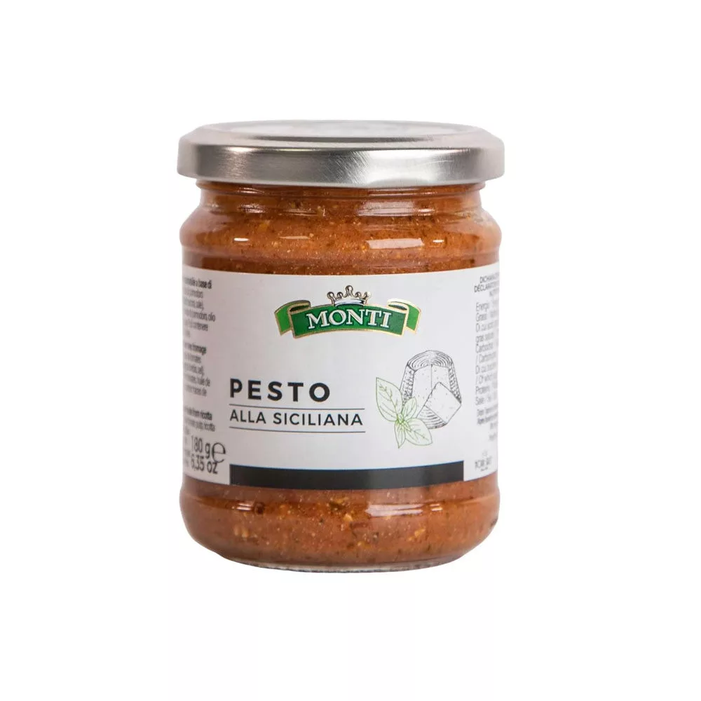 A "Monti" vörös pestót közismerten a "genovai pesto testvérének" nevezik. A recept olasz bazsalikommal, napraforgómagolajjal és első osztályú szárított paradicsommal készül. Az aszalt paradicsom használata erős piros színt ad, így ez a pesto ideális tészta, gnocchi vagy pirított kenyérre kenve.Összetevők:napraforgóolaj, paradicsomszósz, szárított paradicsom (9%), paradicsomkoncentrátum, genovese bazsalikom (5%), kesudió, só, cukor, Pecorino sajt (juhtej, só, oltó), fokhagyma, antioxidáns: aszkorbinsavÁtlagos tápérték 100g termékben:Energia: 1895 kJ/459 kcalZsír: 45 gebből telített zsírsavak: 4,8 gSzénhidrát: 9,7 gamelyből cukrok: 6,3 gFehérje: 3 gSó: 1,6 g
