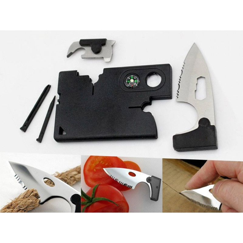 Több funkció: Fogazott kés, sörnyitó, iránytű, nagyító, mérő, kis csavarhúzó, nagy csavarhúzó, csipesz, fogpiszkáló.