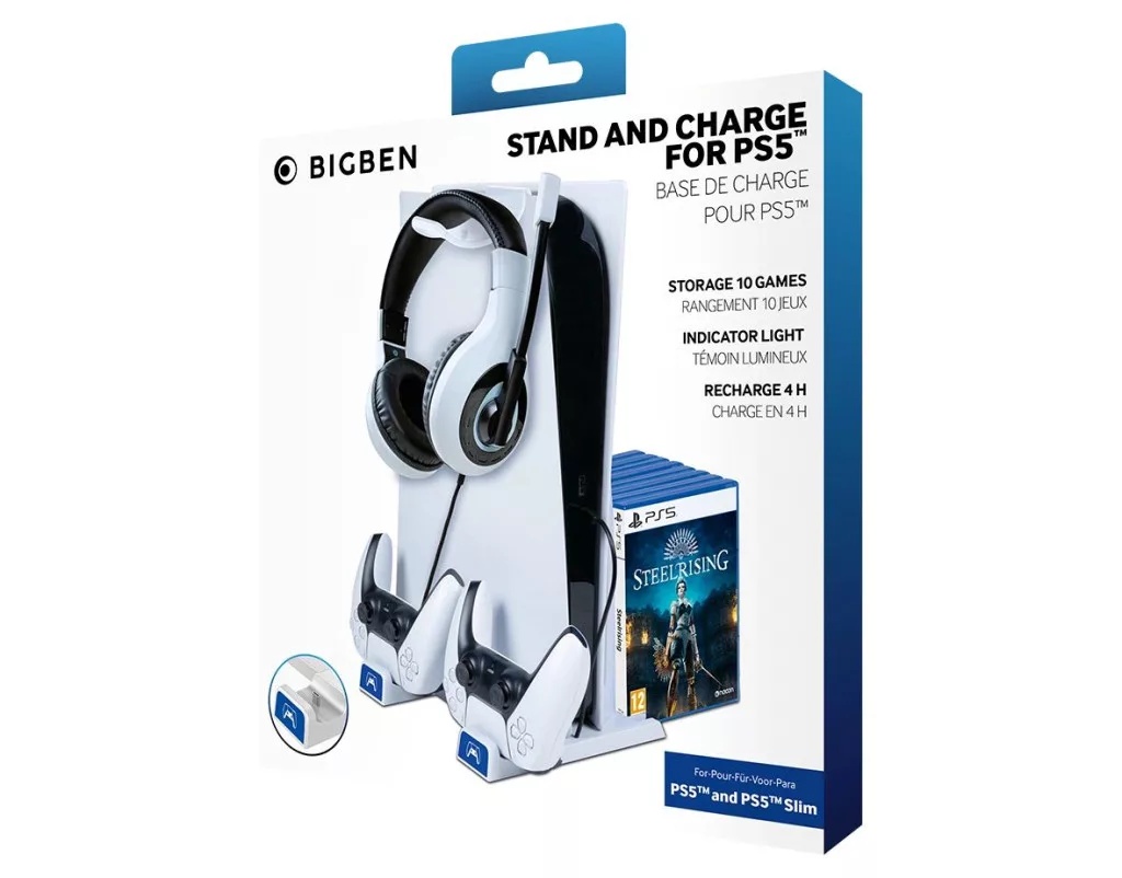 Töltő és tartó állomás PS5 slim és hagyományos konzolokhoz. 2 db DualSense kontroller tölthető rajta. 4 órás töltési idő. Max. 10 db PS5 dobozos játék tárolására van lehetőség. USB-A csatlakozás.