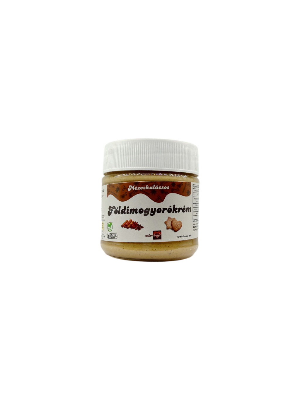 Gluténmentes, vegán földimogyorókrém mézeskalács fűszerezéssel. 80 % földimogyoró tartalommal.