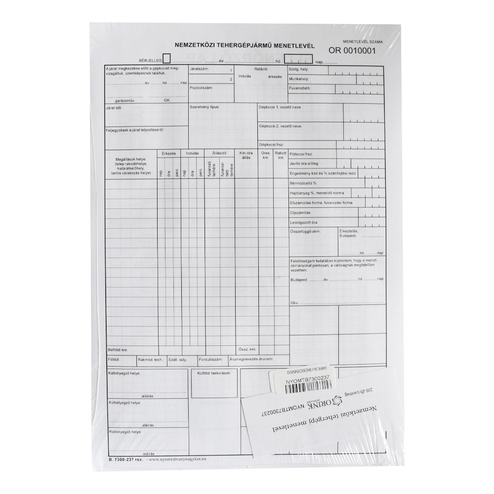 NEMZETKÖZI TEHERGÉPJÁRMŰ MENETLEVÉL SZABADLAP A3 MÉRET B.7300-237