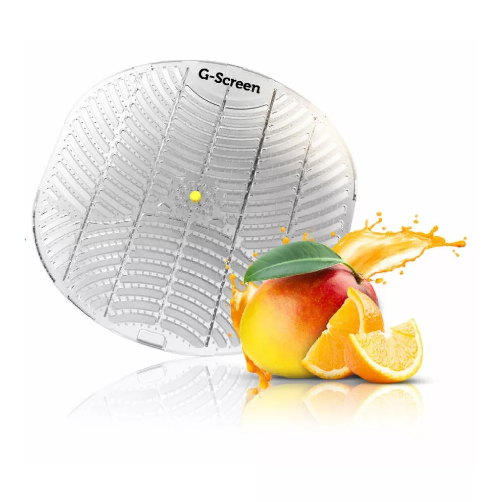 A G-Screen piszoár rácsok, a piszoár higiéniai termékek első generációs modelljei. Anyaguk, a fenntarthatóság jegyében, az újrahasznosítható EVA. A G-Screen piszoár szűrők, formájukat tekintve a fizikai szennyeződések kivédésére lettek tervezve, továbbá felületi kialakításuk által a visszafröccsenés kellemetlen jelenségét is megakadályozzák. Ezek a rácsok használat közben nem mozdulnak el, rugalmasak, de képesek fixen tartani a helyüket, ezáltal szinte minden formájú piszoárba beleilleszthetők. A mérnökök úgy alkották meg a G-SCREEN piszoár rácsok formáját, hogy a lehető legkisebb esélye legyen annak, hogy a szennyeződés átjusson rajta, mindezek mellett fröccsenésmentes használatot biztosít.Egyedi csúszásgátló kialakítása segíti, hogy optimális helyzetben maradjon, használat után pedig kis fogantyú segítségével könnyen kiemelhető. Az illatanyaggal átitatott pissoir rács használattól függően akár 30 napig illatozik, és segít frissen tartani a férfi mosdók légterét. Citrus mangó - Trópusi vidámság a lédús mangó és a napérlelt citrus illataival.