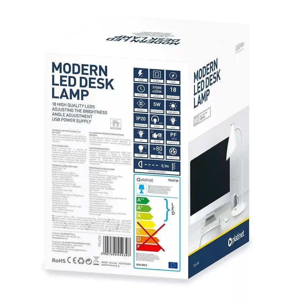 Platinet Rechargeable Desk Lamp 2400mAh 5W White