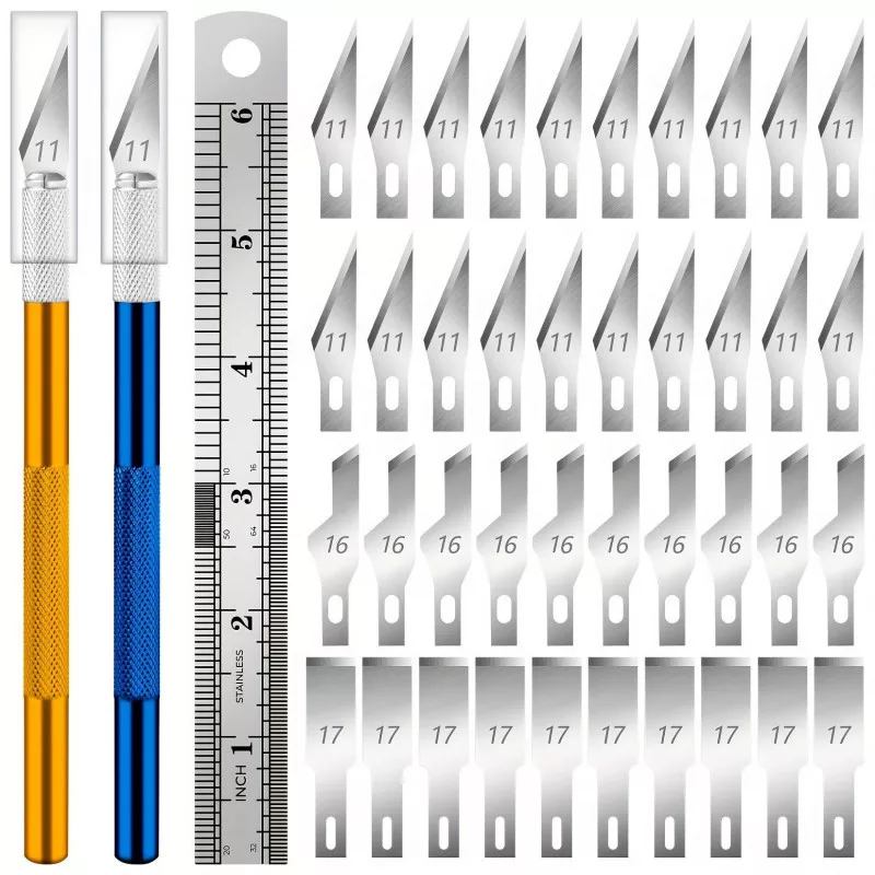 Tulajdonságok:Kézműves kés készlet a precíziós faragáshoz, scrapbookinghoz és stencilkészítéshezTartalmaz 40 tartalék késpenget a folyamatos kreativitáshozNem visszahúzható fogantyú a kényelmes fogáshoz és stabilitáshozSzénacél késpenge a kiváló élességért és tartósságért ️Könnyen használható, akár kezdőként is profi hatást érhetsz el vele
