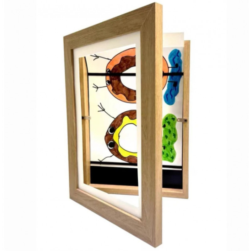 A fa keret ólommentes és edzett, törésálló üveggel rendelkezik, amellyel tiszta rálátást biztosít a műalkotásra. A keret úgy nyílik, mint egy könyv, a belső részen pedig rugalmas pántok találhatók, így a műalkotások tárolhatók, mind vízszintes, mind függőleges irányban alkalmazható. Két gyönyörű szín közül választhatsz. Ez a rajzgyűjtő keret tökéletes dekorációja lesz a nappalidnak.