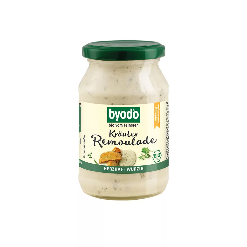 A füvészkertet pohárba varázsoltuk neked. Ízletes uborkadarabok és sok-sok ízletes fűszernövény adja az organikus remulád finoman fűszeres ízét – minden ínyencet élvezet. Összetevők: napraforgó olaj* Ecetes uborka* (24%) (uborka*, szeszes ecet*, répacukor*, tengeri só) Víz nyers nádcukor* sovány TEJPOR* almaecet* DIJON MUSTÁR* (víz, BARNA MUSTÁRMAG*, szeszes ecet*, tengeri só) hagyma* Tengeri só TOJÁSSÁRGA* Gyógynövények* (0,26%) Citromlé koncentrátum* Sárgarépalé koncentrátum* Sűrítőanyag: guargumi* *ellenőrzött biogazdálkodásbólÁtlagos tápérték 100g termékben:Energia: 1970kJ/471 kcalZsír: 50g Amelyből telített zsírsavak: 5,4g Szénhidrát: 5.9g Amelyből cukrok: 5,4g Fehérje: 1,4g Rost: - Só: 1,7g